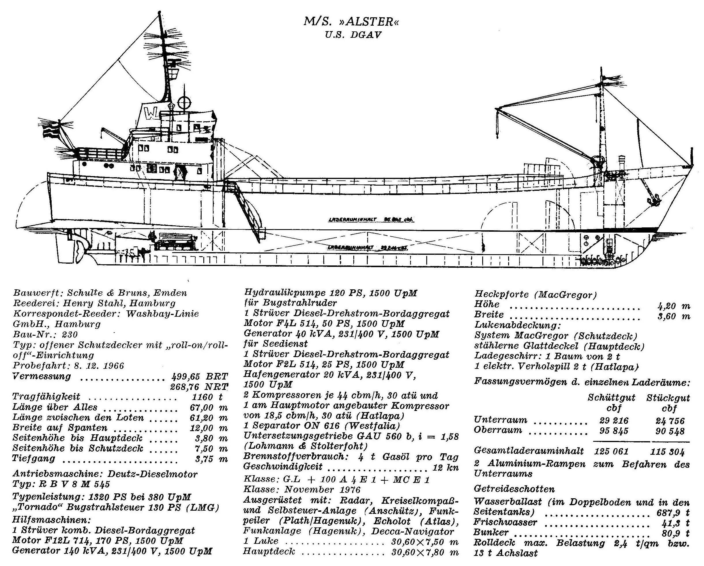 20.10.. 1966 Stapellauf. 08.12. 1966 von der Schulte & Bruns Schiffswerft mit der Baunummer 230 als „ALSTER“ an die Washbay-Line GmbH , Hamburg abgeliefert. 1976 auf Henry Stahl, Hamburg, übertragen. 1980 auf die Henry Stahl(GmbH & Co KG) Hamburg, übertragen. Im November 1983 über die Kuwait Gulflink Transport Co. An M:A: Sadeg, Kuwait, umbenannt in „AL FARIS 1“. 1986 an die Gulf Star Shipping Co. W.L.L., Kuwait. 1089 an ungenannte Eigner in Kingstown(VCT), umbenannt in „RED SEA“. 1992 an Abusal Shipping & Trading Etablissement, Kingstown. 1996 an Omar Riehan, Kingstown; neu vermessen, nun 1647 BRZ. 1998 in Fahrt , weiterer Verbleib unbekannt.